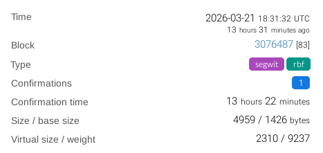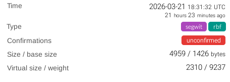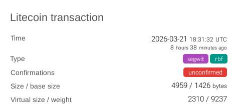 Hi, I’ve been sending LTC as usual using Electrum-LTC, but this is the first time I’ve encountered this. I have a transaction stuck in mempool. The commission is normal (10. sat/byte). And what’s more, sometimes there is even 1 confirmation of a transaction (inside electrum and block explorer) - but with a new block it is again unconfirmed. Lock time 3 076 184 Posted 13 hours ago. Use double spend or fee increase - gives a txn mempool conflict error. I ask for help, I tried to solve it myself, but there is no such problem, everyone either does not have a mempool transaction or zero commission.